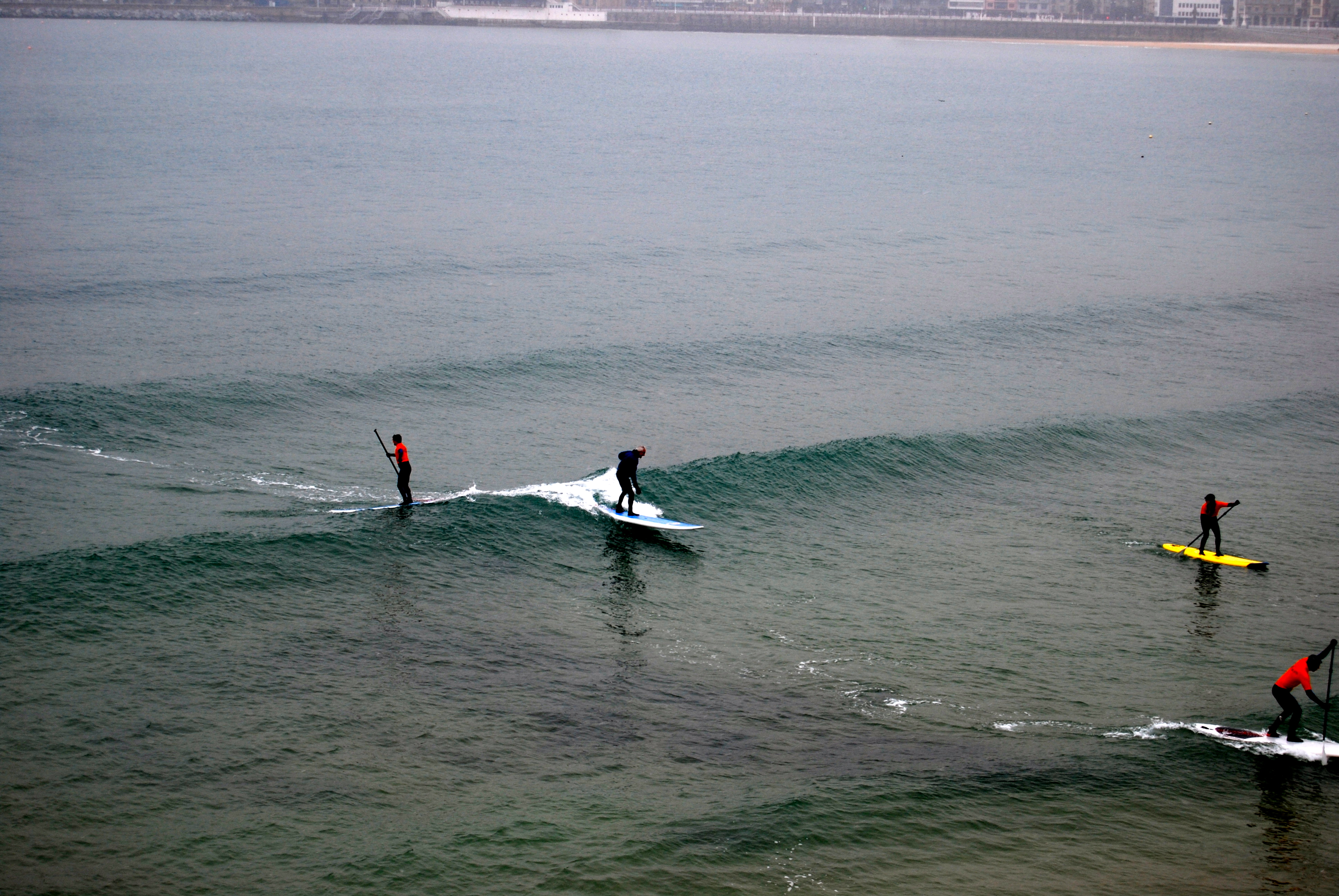 De volgende ochtend was de swell wat ingezakt. Maar niet helemaal weg. En ook nu was de wind niet van de partij. Helaas hadden we zelf geen tijd meer. Maar zie hier de foto’s die we konden schieten van de Suppers in de andere baai (La Concha) van San Sebastian. Ook in die Baai zijn er dus surfmogelijkheden.