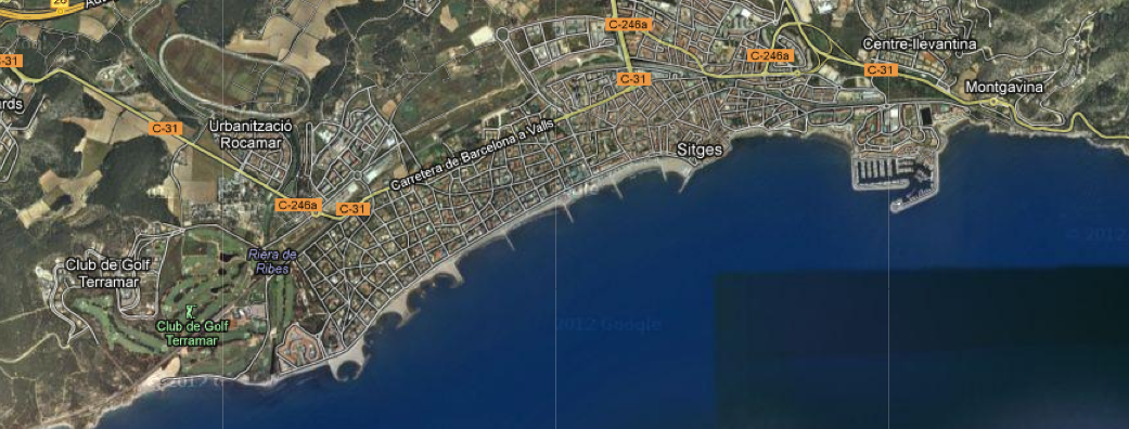 Surfen in Spanje bevalt dus vanaf het eerste moment. De hele middag lagen we tussen de strekdammen van Sitges. Zie ook hieronder. Overigens is het ook rechts van Sitges (als je op de kaart kijkt) goed surfen. Naast de haven.